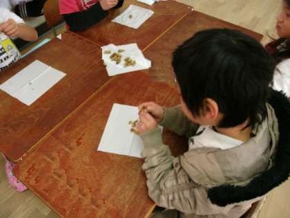 その落花生を塩茹でにして食べました。子どもたちは、なかなか殻がむけず悪戦苦闘しながら、おいしく食べました。