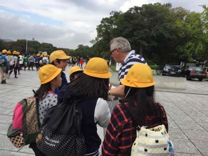 外国語活動の時間に学習した英語を話して、平和についてどう思っているかを伺いました。