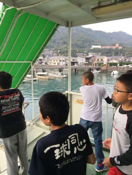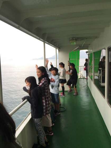 大久野島へ向けて、短い時間ですが、みんな甲板に出て、潮風を感じ、気持ち良さそうです。