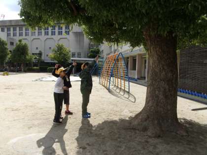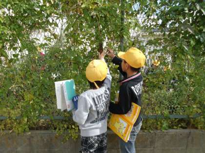 秋の校庭で、葉が色づいていたり、生き物がなかなか見当たらないことにも気がつきました。春に植えたヘチマの収穫も行いました。
