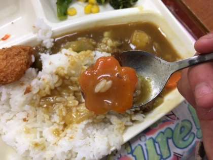 エビフライカレーライスの中に『ラッキーにんじん』を給食調理員さんが作ってくれました。