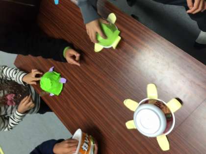 2年生は生活科で、牛乳パックや空き容器などを使って、うごくおもちゃを作りました。