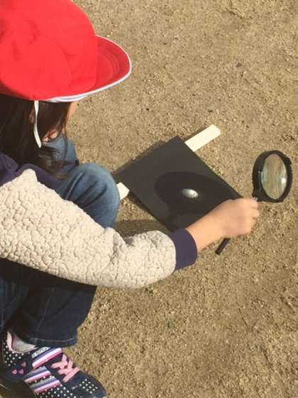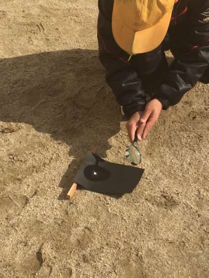 虫めがねで集めた日光を、黒い紙に当てる実験をしました。