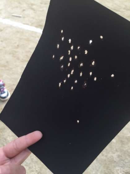虫めがねを上下に動かしながら、明るい部分を小さくすると、けむりが出てきて黒い紙がこげました。
