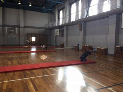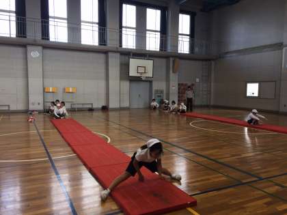 まとめでは、練習した技を組み合わせて発表しました。子どもたちがそれぞれに組み合わせを考え、一生懸命練習をしました。練習中も、友だちの技を見て「すごい!」「きれいにできてる!」などの声が聞こえてきました。