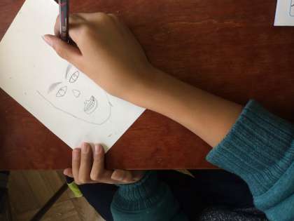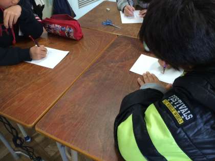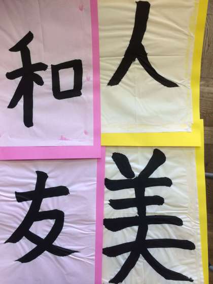 *玄関に2月、習字で書いた一文字と似顔絵を掲示する予定です。