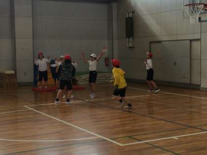*円陣の写真は、2チームに分かれての体つくりゲームの様子です。