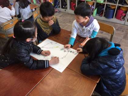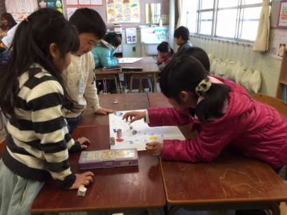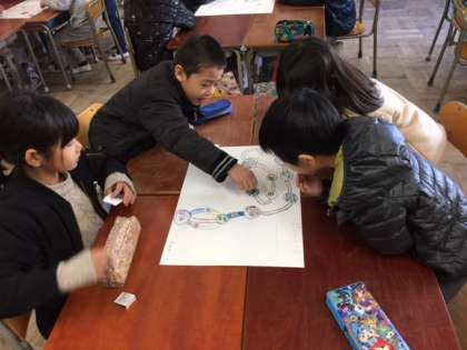 自分たちで作ったすごろくを使って、班で遊んでみました。