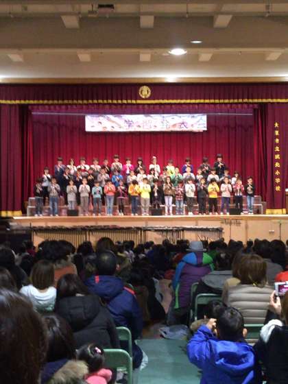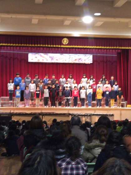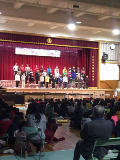 4年生 テーマ「ありがとう」 群読「あなたがうまれるまで」「4年1組友だちの詩」 合唱「誕生日」 合奏「にじいろ」