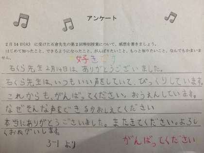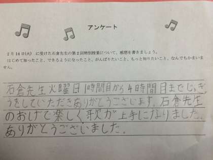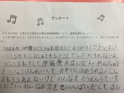 *子どもの感想用紙(先週の石倉先生の授業後に書いたものです)からも、感謝の気持ちがひしひしと伝わります!
