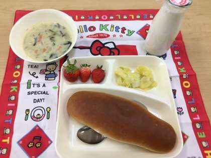 今日の給食献立は、ほうれん草のクリームシチュー、キャベツのサラダ、いちご、こくとうパン、牛乳でした。
