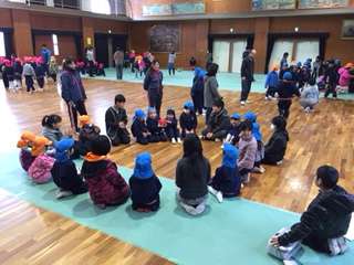 赤川幼稚園と生江保育所の幼児が6つに分かれ、合同の班をつくりました。
