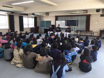 子どもたちは、夢を持つことや努力すること、困難なことに挑むことや食事の大切さなどの話を真剣な眼差しで聞いていました。