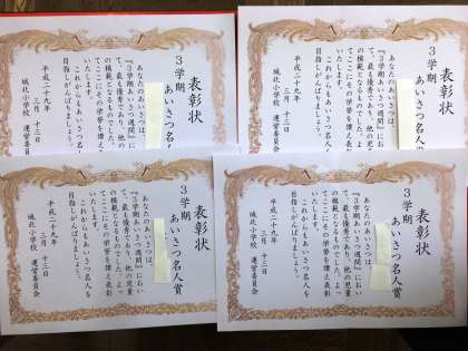 今朝、児童朝会で、あいさつ週間や図工の時間に描いた絵のコンクールの表彰がありました。