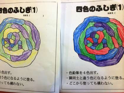 条件は、4色の色鉛筆を使って、同じ色が隣同士にならないで塗りきることです。