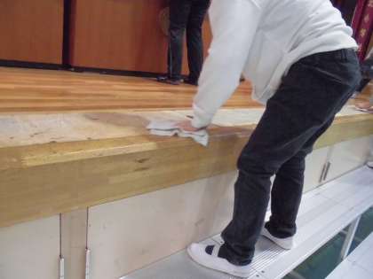 階段、廊下、玄関、講堂などの掃き掃除やふき掃除をしました。