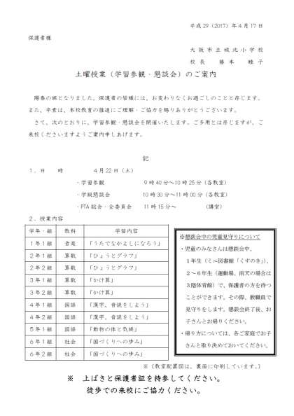 学級懇談会中は、1年生(ミニ図書館くすのき、1年教室すぐ)、2〜6年生(運動場、雨の場合は体育館)で、保護者の方をまつことができます。お子様と帰り方をあらかじめ話し合っておいてください。