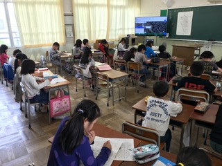 社会の時間に絵地図づくりをしました。電子黒板で航空写真を見たり、学校の屋上に上がって取った校区のメモを参考にしたりして、みんな一生懸命つくっていました。