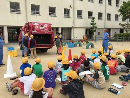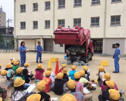 また、パッカー車1台が1日に回収するお家は約1800軒で、ごみの量は約9tもあることを知り、子どもたちはとても驚いていました。ごみの分別や処分についての話を通して、各自ごみを減らすためにできることを考える環境学習に繋げていきたいと思います。
