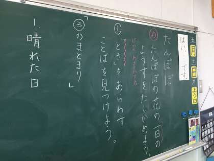 国語の時間に、「たんぽぽの花の1日のようす」を確かめる学習をしました。本文の中から、「とき(時間など)」を表す言葉を探し、たんぽぽの変化について考えました。