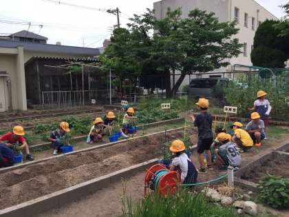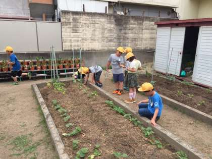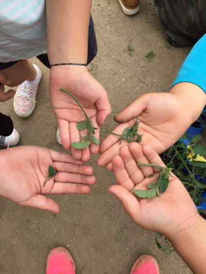 トマトが日に日に、大きく成長してきています。今日は、「わきめ(脇芽)」を摘みました。自分たちの、トマトをよく観察して丁寧にわきめを摘み取っていました。