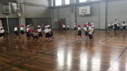 線の上をグループではぐれないように歩き、ほかのグループと出会ったら体を大きく使ってじゃんけんをします。