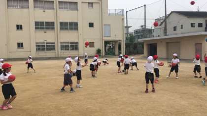 上に投げ上げたボールを、手をたたいてからとったり、回ってからとったり、座ってとったり・・・。