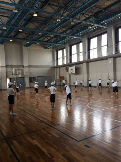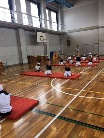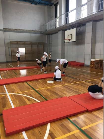 今日は、体育館でマット運動をしました。グループごとにマットの準備をして、大きな前転の練習をしました。グループのメンバー同士でアドバイスをしたり、励まし合ったり姿が見られました。
