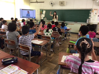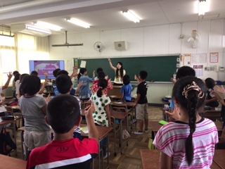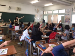 1から10までを英語や韓国語、フランス語などを聞いてどの国の数字か当てたり、先生がするジェスチャーを英語で答えたり、英語で王様ジャンケンをしたり、楽しんでいました。