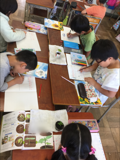 子葉と葉の形や葉の枚数など気づいたことをノートに書きました。