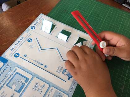 図工の時間には、初めて「カッターナイフ」を手にしました。カッターナイフを使う手は、本当に慎重で安全に使うための約束をきちんと守っていました。