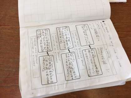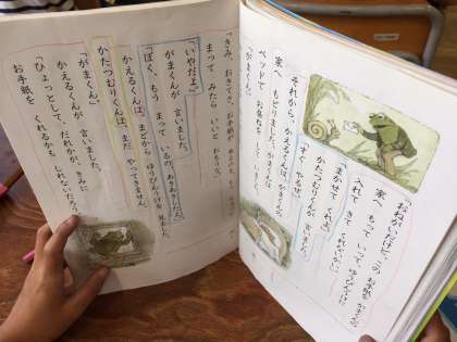 もう1時間の国語の学習では、「お手紙」を読んでワークシートに取り組みました。教科書の文にたくさん線を引き、ワークシートの問いの答えを探しました。文を読んで、答えを見つけるのが上手になってきています。