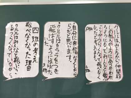 子どもたちは毎日音読練習に励み、本文を読み取るときには教科書にサイドラインを引きながら読み取りを進めるなど、意欲的に国語の学習に取り組んでいます。今日は、風切るつばさの作者が、この物語を通して何を伝えたいのか(主題)について考えました。みんなで話し合って導きだした答えは、「人は助け合って生きていくものだ。」「人は助け合うことが大切。」としっかりと読みを深めることができました。