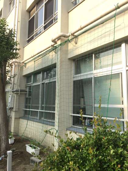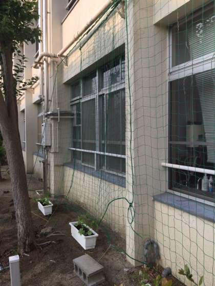 職員室裏に、緑のカーテンの準備ができました。