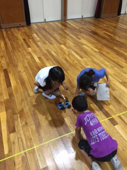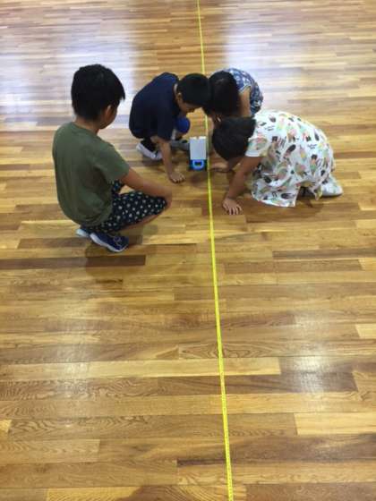 送風機(サーキュレーター)を使って、風が強い時と弱い時の車が動くきょりを比べました。
