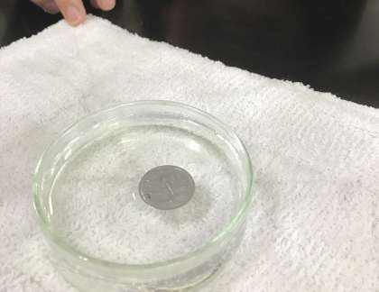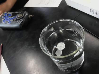 「一円玉は水に浮くか」「洗剤を混ぜた水だと一円玉は浮くか」という表面張力の授業では、班のみんなと協力して一生懸命頑張りました。