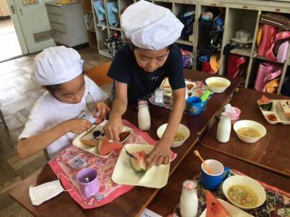 学習園で育てていたスイカを、給食の時間に食べました♪