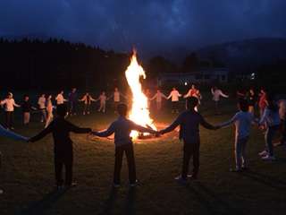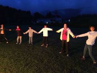 みんなで輪になって、司会の『キャッチ』の声と同時に隣の友だちの指をキャッチします!