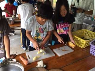 野菜を切る人と、薪で火をおこす人に分かれ、作業します。