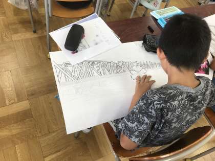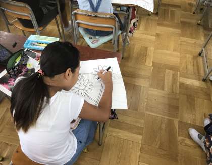 1学期に撮影した赤川鉄橋を描き、そこに自分で選んだきれいな花を重ね描きしています。