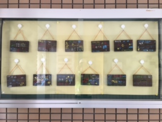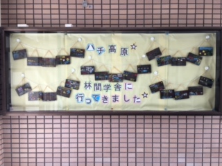 9月の玄関掲示は、林間学舎で作った焼き板を展示しています。作品を見ていると、林間学舎での思い出がよみがえってきますね。