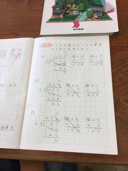 算数の学習でわり算の筆算をしています。今日は、わられる数が3けたになったときの筆算の仕方について学習しました。