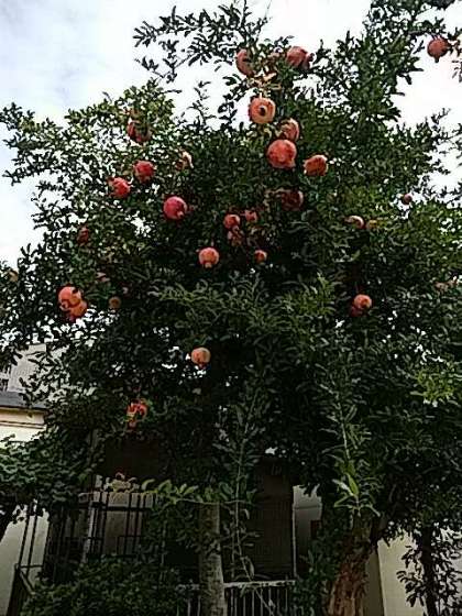 校庭に赤いざくろが、鈴なりに実っています。