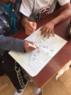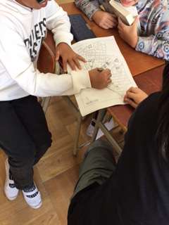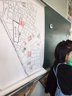 現在、外国語活動で道案内をしています。自分たちが住んでいる地域の地図を使って、公園、スーパー、コンビニなどまで、道案内を行いました。