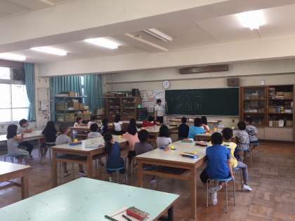 図工の学習では、「空飛ぶダンゴ虫」のいる世界の「風の道」を表現しました。
