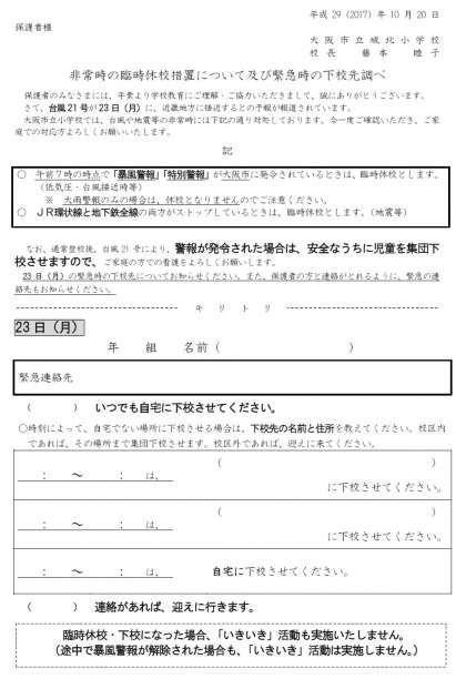 非常時の下校先について用紙に記入し、担任までご提出ください。