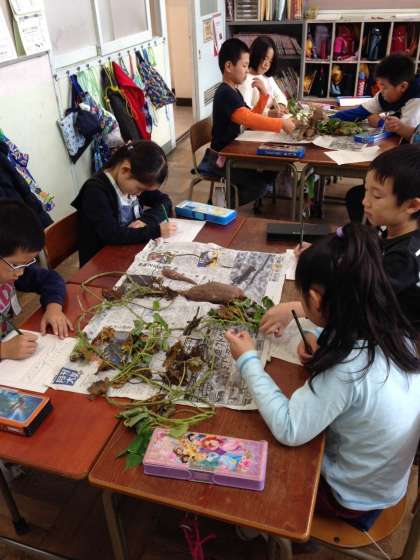 先日、収穫したさつまいもを観察しました。生活科の観察カードには、本物のいもをよく見て丁寧に絵が描かれています。また、いもの様子について文章でも上手に表すことができています。