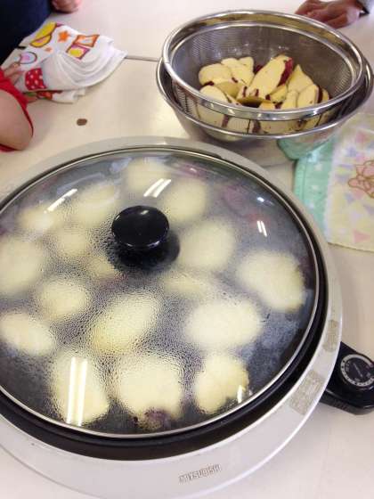 自分たちで育てたさつまいもをホットプレートで焼きました。焼いたての、おいもはホクホクしてとてもおいしかったです。残ったおいもをお家にもって帰っていますので、見てあげてください。