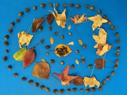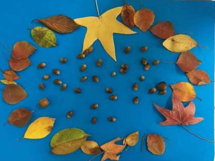 青色の画用紙の上に、落ち葉やドングリを思い思いに並べて表現しています。