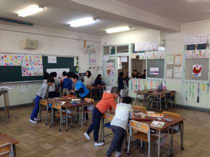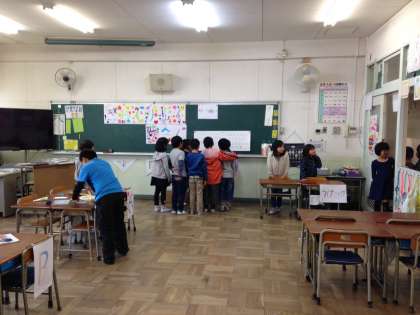 今日の5時間目に、明日のなかよしフェスタのお店の準備をしました。